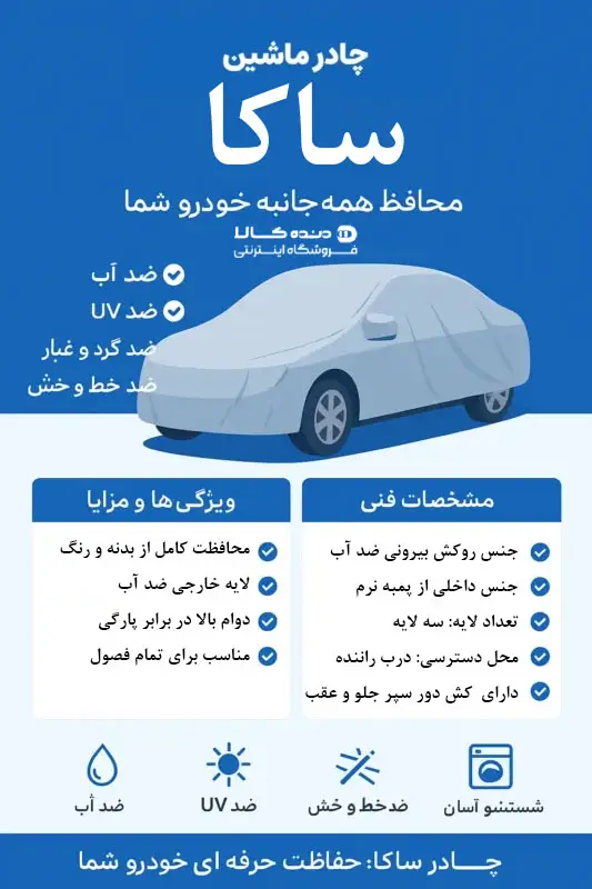 چادر ساکا از پارچه مقاوم و ضدآب ساخته شده و دارای لایه پنبهای داخلی است که از بدنه خودرو در برابر خط و خش محافظت میکند و در عین حال مقاومت خوبی در برابر شرایط محیطی دارد.